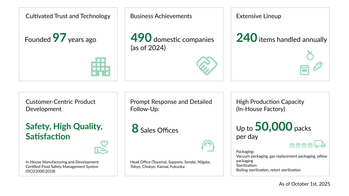 We have grown our business by offering the blessings of nature, such as wild vegetables, as ingredients for home use. Today, under our corporate philosophy of “Creating and Fulfilling Happiness,” we focus on processing vegetables and wild vegetables, with a mission to provide safe, delicious, and healthy food.