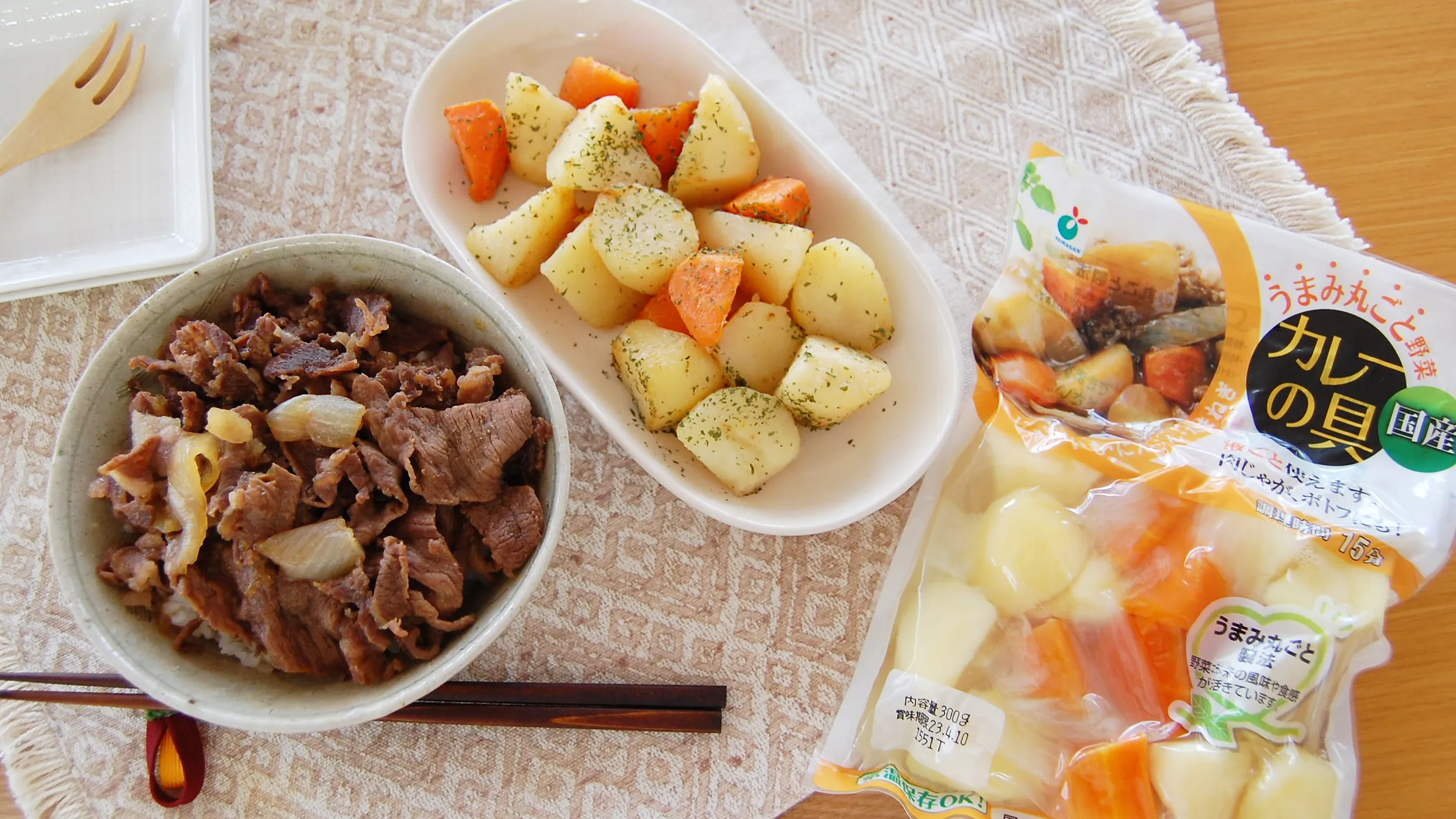 ①「うまみ丸ごと野菜 国産カレーの具」のじゃがいもとにんじんを取り出す。